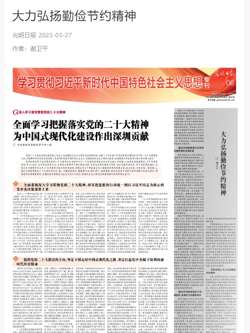 3月27日,《光明日报》“学习贯彻习近平新时代中国特色社会主义思想”专刊发表了beat365官网马克思主义学院谢卫平教授署名的理论文章《大力弘扬勤俭节约精神》。