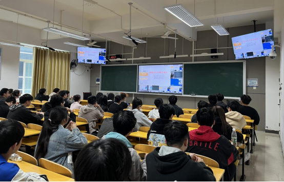 本次授课依托beat365官网新建的14间智慧互动型教室,首次采取“1主讲课堂+13听讲课堂”教学模式。在主讲教室,侧边屏幕能显示出听讲教室学生的画面,同时教师讲课的镜头和PPT画面也实时传送到了13间听讲教室。