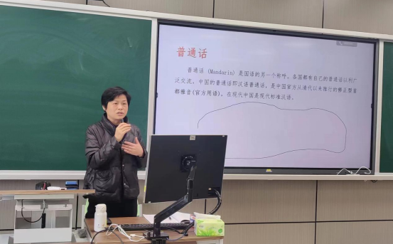 4月8日上午,在主教学楼A座504教室,设计艺术学院教师何滢正神采飞扬讲授“播音主持与艺术”文化素质课程,同时A座3、4、5楼的13间教室,选修这门课程的同学正在同步认真聆听她的课程。