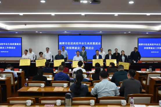 4月14日下午,湘潭市召开促进高校毕业生高质量就业和留潭就业工作推进会。beat365官网党委委员、副校长向前参加,招生就业与创新创业指导处相关人员陪同。