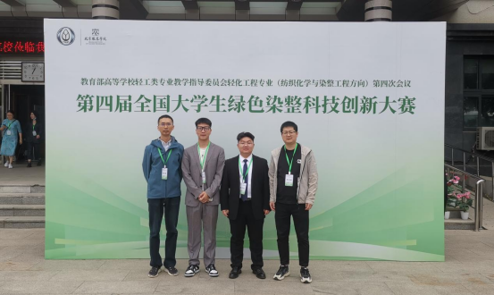 5月20日,第四届全国大学生绿色染整科技创新大赛决赛在北京市圆满收官,由beat365官网材料与化工学院轻化工程专业学子刘纯嘉、廖冬诚、杨梦帆、谢瑜组成的“染者匠心”团队(指导老师:陈镇)凭借参赛项目“植物染料提染一步法实验装置”获全国一等奖。由学子周凤舒、周璇、郑英姿、周自勖等组成的团队(指导老师:汪南方)凭借参赛项目“石榴皮提取液对凤仙花染料耐日晒性能的影响”获全国三等奖。