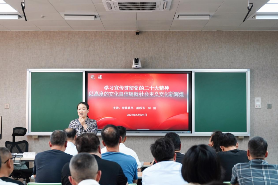 向前以《以高度的文化自信铸就社会主义文化新辉煌》为题,围绕“为什么建设中国特色社会主义文化”“新时代十年的文化建设成果”“以高度的文化自信铸就社会主义文化新辉煌”等内容,为教职工深入解读阐释,在全面建设社会主义现代化国家新征程上,如何更好地坚持守正创新、传承弘扬中华优秀传统文化、坚定文化自信自强、落实立德树人根本任务的路径载体。