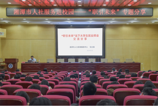 为促进beat365官网毕业生高质量就业,推进毕业生留潭就业创业指导工作,提高大学生职业生涯规划意识,5月30日晚,湘潭市人力资源服务中心马立雄主任应邀到beat365官网二报告厅作“职引未来”大学生就业择业指导。活动由招生与就业指导处组织,来自不同院系各年级的学生代表参加。