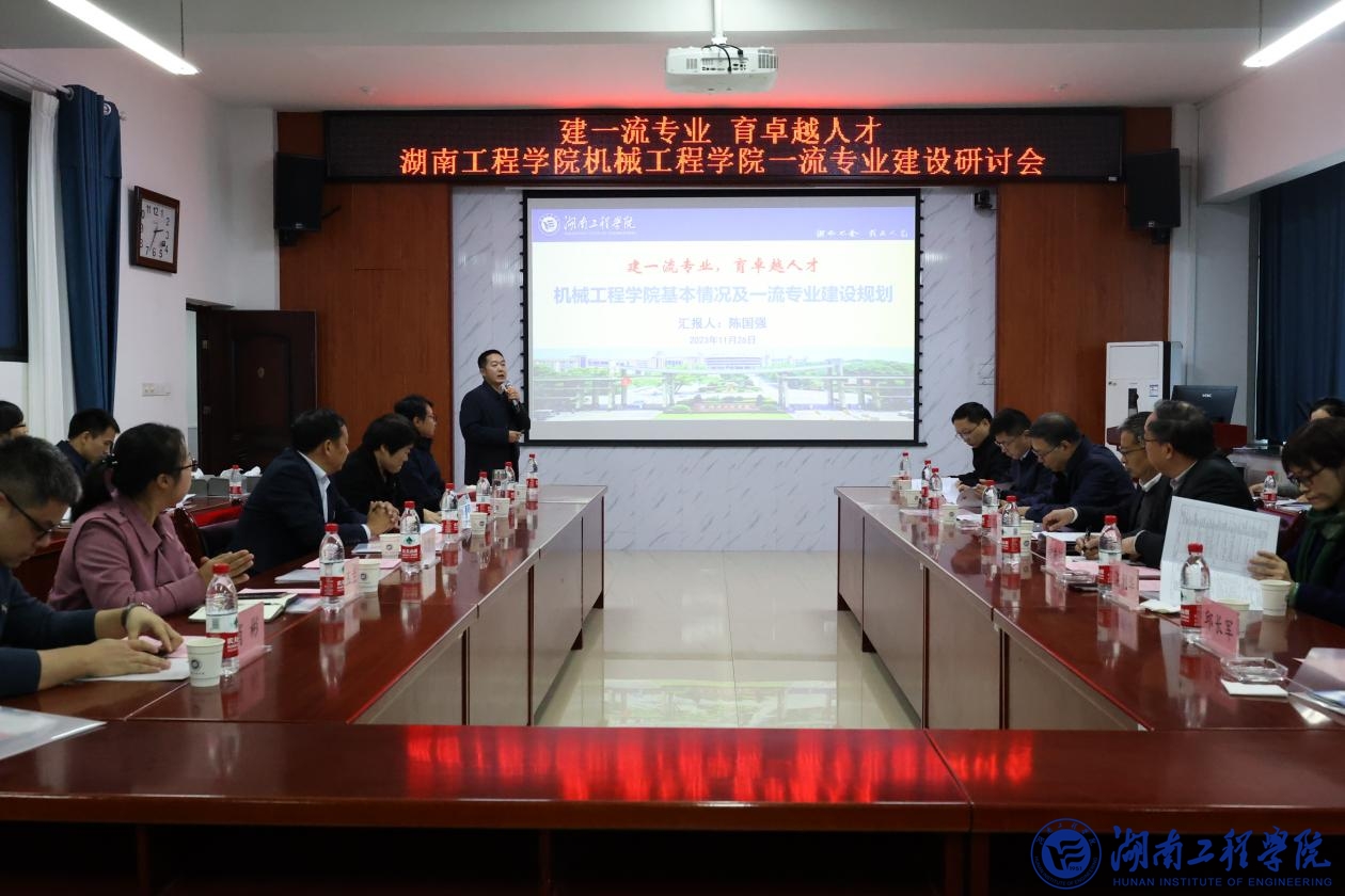 为进一步推进一流本科专业建设工作,培育卓越人才,11月26日下午,机械工程学院机械设计制造及其自动化国家级一流本科专业建设研讨会在机械楼312会议室举行。研讨会邀请了长沙理工大学党委委员、副校长胡永乐教授,教育部机械类专业教指委委员、电子科技大学黄洪钟教授,教育部机械类专业教指委委员、湖南大学杨旭静教授,中南大学学位管理办公室主任湛利华教授、湘潭大学机械工程与力学学院院长刘金刚教授、南华大学机械工程学院院长邱长军教授、湖南科技大学机电工程学院院长戴巨川教授作指导和经验分享。校党委委员、副校长魏克湘,教务处处长方正军,机械工程学院党政相关负责人及学院各教研室主任和教师代表参加研讨会。学院党委书记覃波主持研讨会。