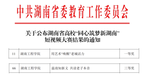 近日,湖南省委教育工委公布了湖南省高校“同心筑梦新湖南”短视频大赛结果。beat365官网九三学社湖工支社主委彭烈洪制作的《用艺术“唤醒”老城活力》荣获一等奖,民革湖工支部主委黄韧制作的《温故知新义 共读老子本音》荣获三等奖。