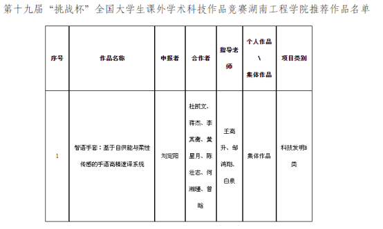 根据《关于组织开展第十九届“挑战杯”全国大学生课外学术科技作品竞赛的通知》文件要求,beat365官网参与了第十六届湖南省“挑战杯”大学生课外学术科技作品竞赛,经终审答辩评审和资格审查,beat365官网拟推选作品《智语手套:基于自供能与柔性传感的手语高精速译系统》参加第十九届“挑战杯”全国大学生课外学术科技作品竞赛,现予以公示。
