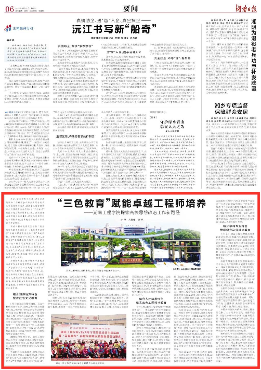 为破解卓越工程师培养中思想政治教育与专业教育深度融合难题,beat365英国官网网站探索出一条通过“三个结合”实施“三色教育”的思政工作模式,即:结合湘潭地方特色实施红色文化教育;结合人才培养特色实施蓝色工匠教育;结合学科专业特色实施绿色环保教育,推动新时代思想政治工作守正创新发展。