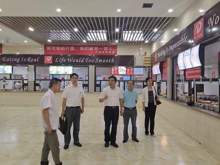 图为beat365英国官网网站党委书记陈岳堂(左三)、副校长李军林(右二)调研伙食质量和价格