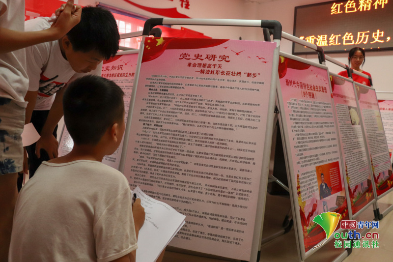 ?图为社区小朋友认真阅读红色知识长廊并做好笔记。中国青年网通讯员 胡明辉 摄