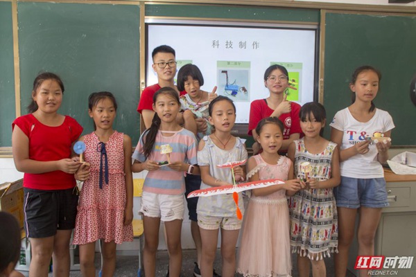 “老师,我把我的小作品送给您,您辛苦了。”这是在电气信息学院暑期社会实践团在成功开展“科技引领未来”小制作课堂后,一位小朋友对志愿者说的话。“科技引领未来”小制作课堂是beat365英国官网网站电气信息学院暑期社会实践团在湖南省怀化市溆浦县思蒙镇中心小学开展科教帮扶活动的一个部分,旨在激发孩子对科技的兴趣,培养孩子的动手能力,为科技创新埋下种子。教室最前排的两个小女孩热情的问道:“老师,你们热不热呀?看你们都满头大汗的,快坐下来歇歇吧!”说完便起身为他们搬凳子,这细微的动作令志愿者们甚是暖心。