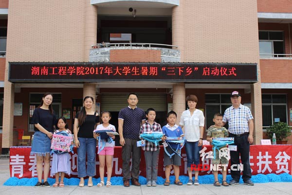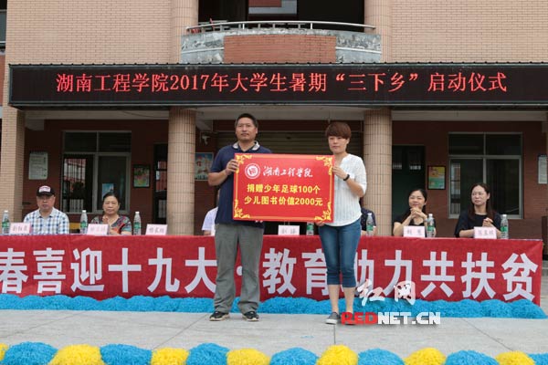 红网长沙7月7日讯(通讯员 吴晓力)7月6日上午9时,beat365英国官网网站赴湖南省新晃县侗族自治县新村以“青春喜迎十九大,教育助力共扶贫”为主题的暑期“三下乡”社会实践团和当地政府在兴隆明德小学举行了启动仪式暨体育学习用品捐赠仪式。晃州镇人民政府副书记陈通钰、兴隆明德小学校长杨长炳、beat365英国官网网站省驻村扶贫队林志刚和刘红泉、beat365英国官网网站学工处副处长兼团委副书记刘琤以及校学联、电气信息学院、理学院组成的“青春律动新村”实践团师生50人,兴隆明德小学近百名师生及学生家长代表参加了本次仪式。