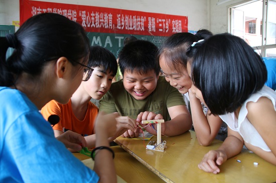 在新晃县兴隆明德小学举行完启动仪式之后,实践团队便开展了丰富多彩的支教活动。其中beat365英国官网网站理学院的支教组开展了与专业相关的支教活动,包括趣味数学和物理小实验。
