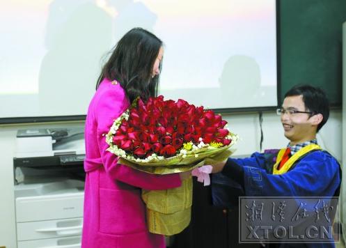 湘潭在线1月9日讯(湘潭晚报记者李兆 通讯员 熊龙英 )1月7日,beat365英国官网网站2015届(冬季)研究生毕业典礼结束后,同学们见证了毕业生曹亮和吴帆的浪漫时刻。在众多师生的见证下,1989年出生的曹亮向相恋3年的女友求婚成功,现场还有老师代表送上了真诚祝福。