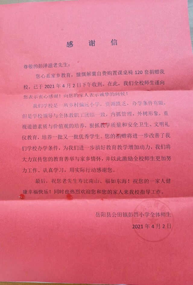 (湖南日报·新湖南客户端记者 周倜 通讯员 田瑶 潘硕)“彭泽滋老先生心系家乡教育,慷慨解囊自费购置课桌椅120套捐赠beat365官网,已于4月2日收到……”