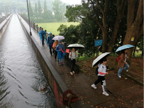 返程途中,伴着淅淅沥沥的小雨,全体党员披着雨衣,一路高歌,沿着“韶山银河”渡槽渠道步行7公里走到湘潭县金盆塘。踏上宏伟壮阔的渡槽、碧水沙堤、便民桥和踏步码头,仿佛又回到了那激情燃烧的火红年代,感受到了当年建设者们“愚公有移山之志,我们有穿山之勇”的豪情,切实体会到了老一辈水利工作者艰苦奋斗、无私奉献的爱国主义情怀。