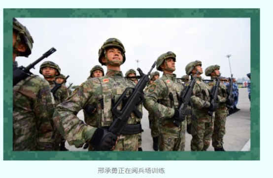 当时邢承勇的新兵营班长曾两次受阅,听着班长的故事,邢承勇深刻感受到了“受阅”的光荣感和自豪感。“有一次在跟班长聊天,班长说想让我跟他以后一起参阅,我想也没想就说了好,结果亲切和蔼的班长就突然转变画风,开始拉着我疯狂训练……”在班长的带领和督促下,邢承勇积极调整心态,逐渐跟上了军营节奏。
