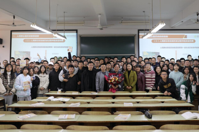 短短40分钟的课很快过去,在学生们意犹未尽中,黄顺年向大家告别。但一份不期而至的惊喜冲散了离别的伤感:教室门打开了,马克思主义学院班子成员、原理教研室部分教师手捧鲜花来到教室中央,将鲜花献给黄顺年,向他圆满的职业生涯表示祝贺。与此同时,同学们一拥而上,簇拥在他的身旁合影留念。
