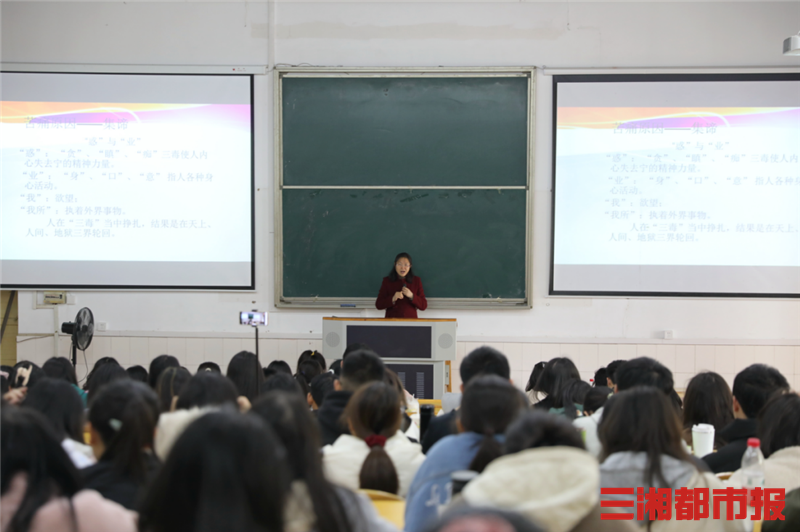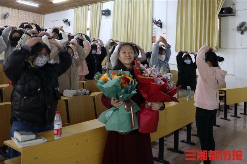 三湘都市报3月25日讯(通讯员 杨欢 全媒体记者 刘镇东 黄京)“感恩的心,感谢有你,伴我一生,让我有勇气做我自己……”3月24日上午,beat365英国官网网站电教楼105教室传来阵阵歌声。教室内,2021级广告学专业学生用一曲《感恩的心》,为该校设计艺术学院熊国玲老师的“最后一课”划上圆满句号。
